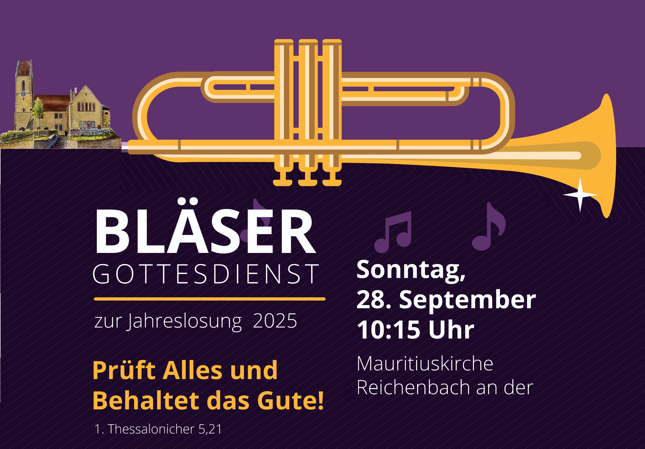 Unter dem Motto der Jahreslosung findet am Sonntag, dem 28. September 2025 um 10.15 Uhr in der Mauritiuskirche in Reichenbach ein Bläsergottesdienst statt. Zu hören sind festliche Bläsermusiken alter Meister, zeitgenössische Kompositionen und textgebundene Liedbearbeitungen in Anlehnung an die Jahreslosung.